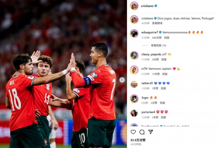 他也在赛后通过社媒晒出全队庆祝照,并配文:“两场比赛,两场胜利!加油,葡萄牙!”