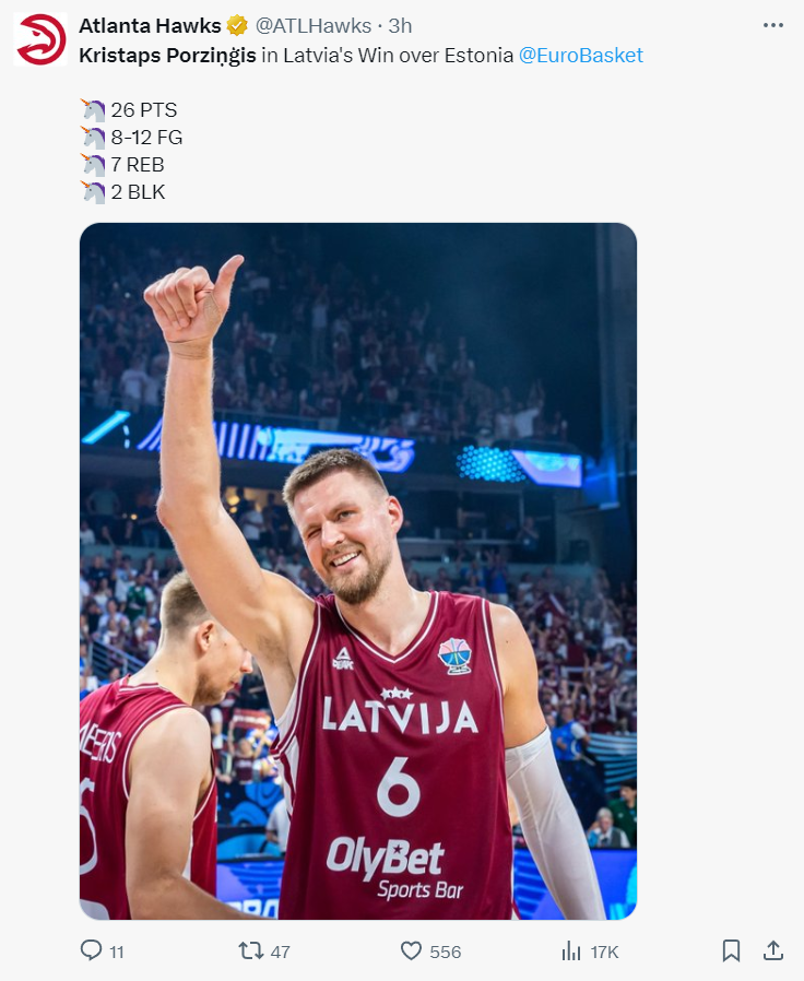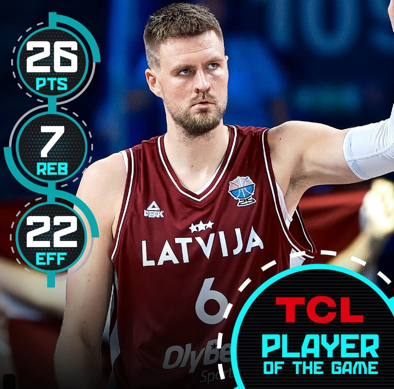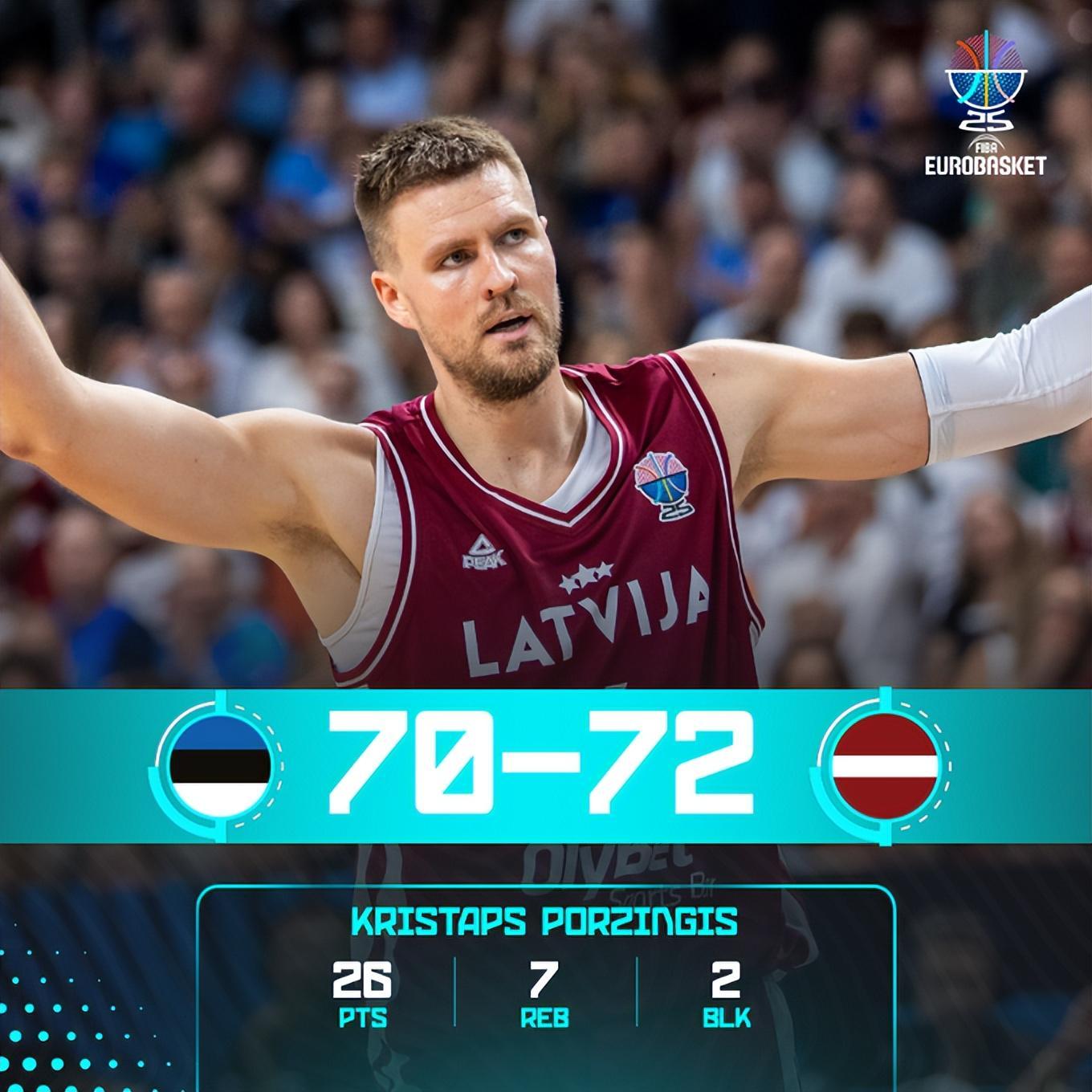 北京时间8月29日晚,2025年男篮欧洲杯小组赛,拉脱维亚72-70险胜爱沙尼亚拿到首胜,目前战绩1胜1负。这场比赛拉脱维亚的胜利要归功于波尔津吉斯的觉醒,他在末节连拿8分帮助拉脱维亚确立优势,爱沙尼亚追分未果。