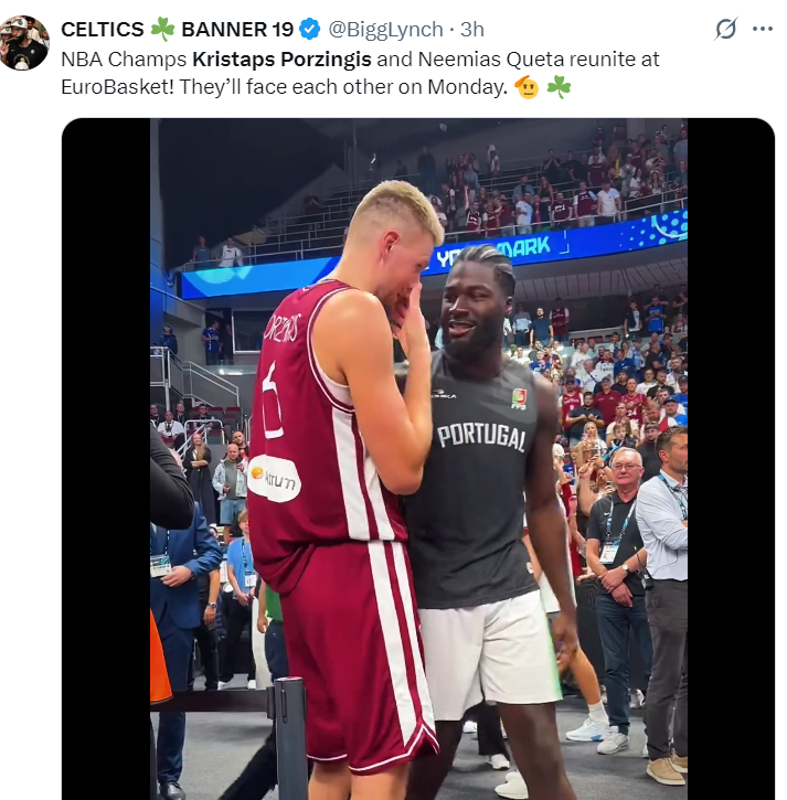 赛后波神也遇上了自己上赛季绿凯的队友克塔,身高2.13米的克塔在身高2.21米的波神身边还是显得非常较小,两人相谈甚欢。